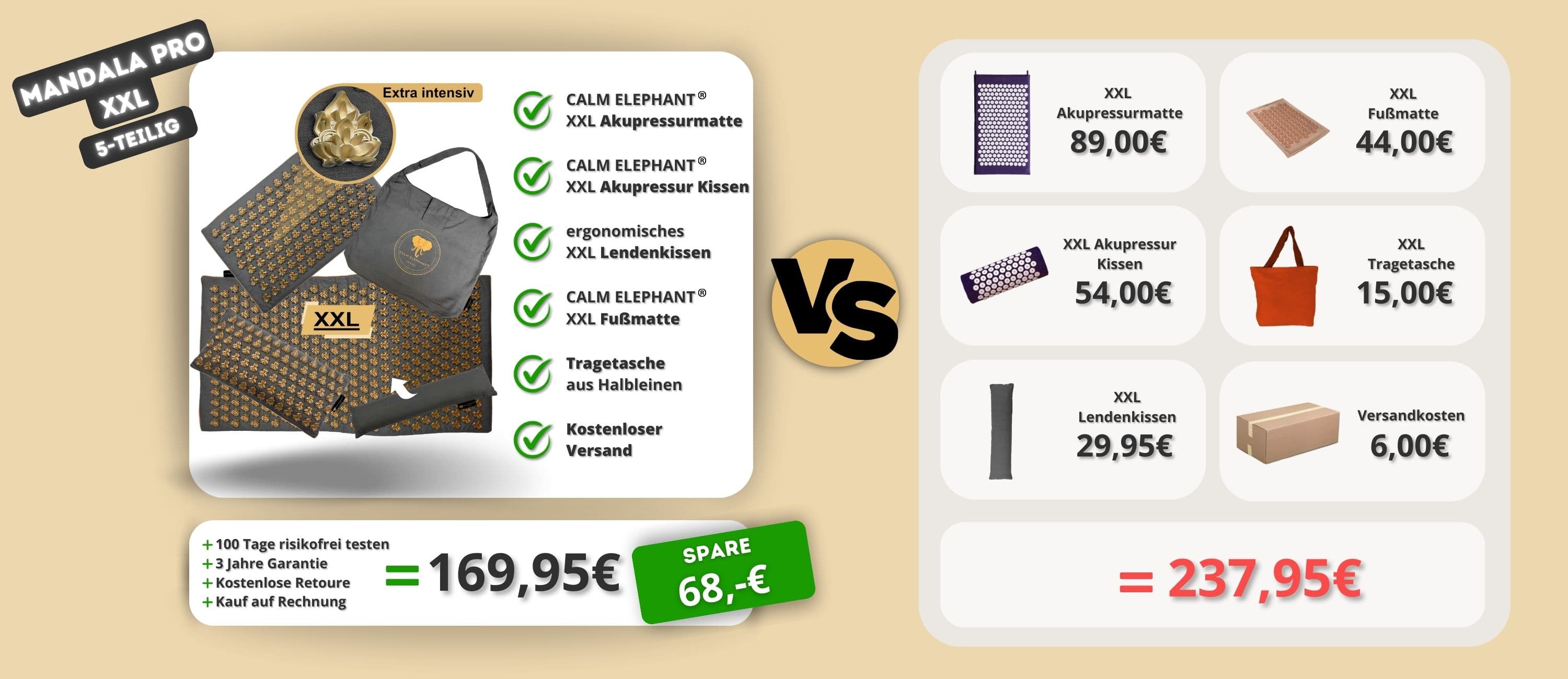Nach dem ich jahrelang eine günstige Matte + Kopfkissen verwendet habe, wollte ich mehr und habe mir das Mandala pro xxL Set intensive bestellt. Der Unterschied ist unglaublich! Das Set wurde super schnell in sicherer Verpackung geliefert. Die Verarbeitung ist top! Der Effekt ist sehr intensiv! Uneingeschränkte Kaufempfehlung!!!